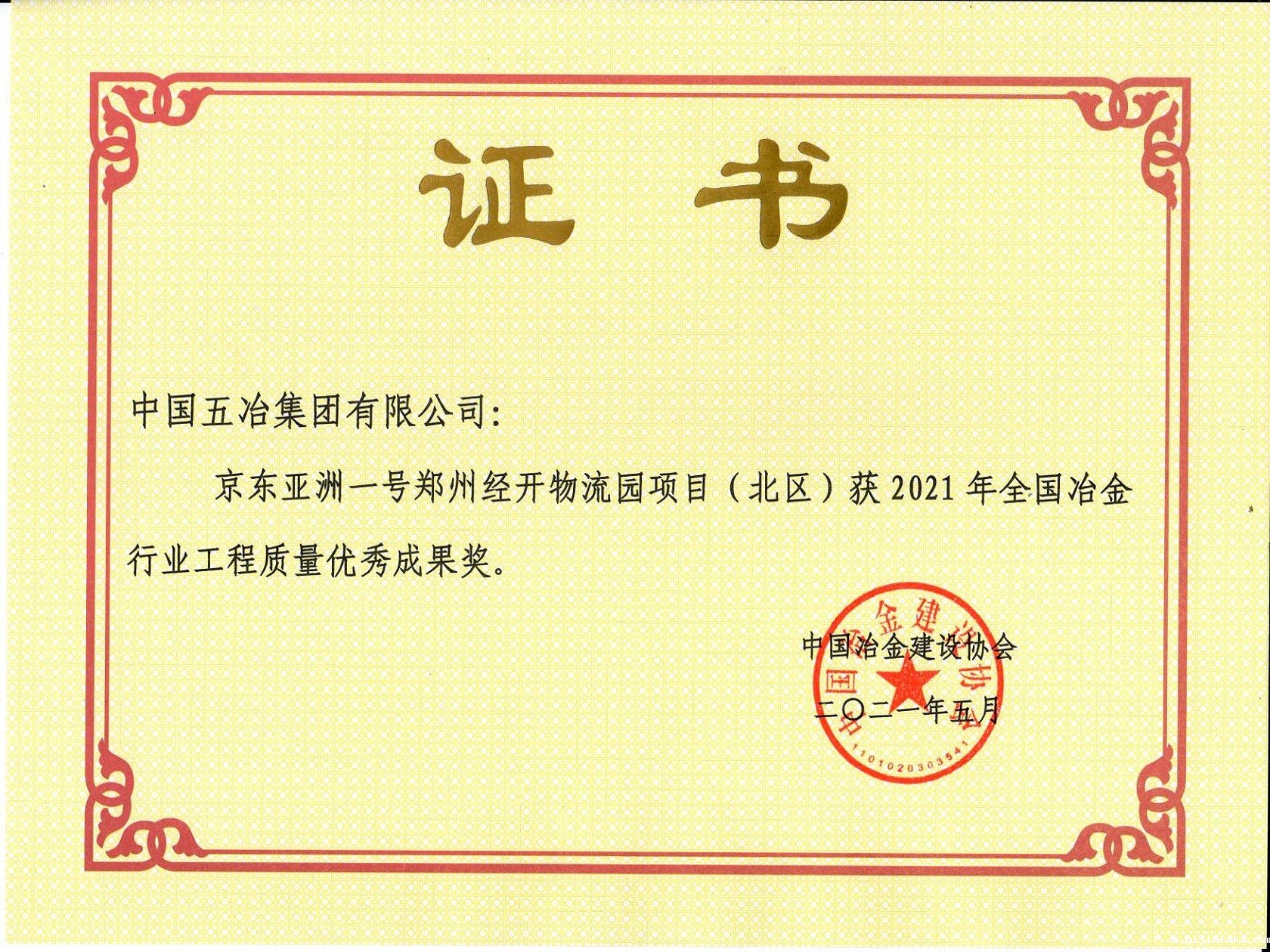 京东亚洲一号郑州经开物流园项目(北区)荣获2021年全国冶金行业工程质量优秀成果奖