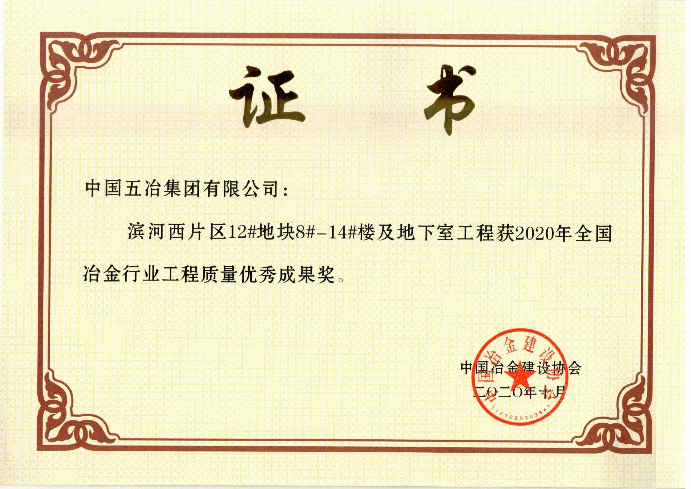 滨河西片区12#地块8#-14#楼及地下室工程获2020年全国冶金行业工程质量优秀成果奖