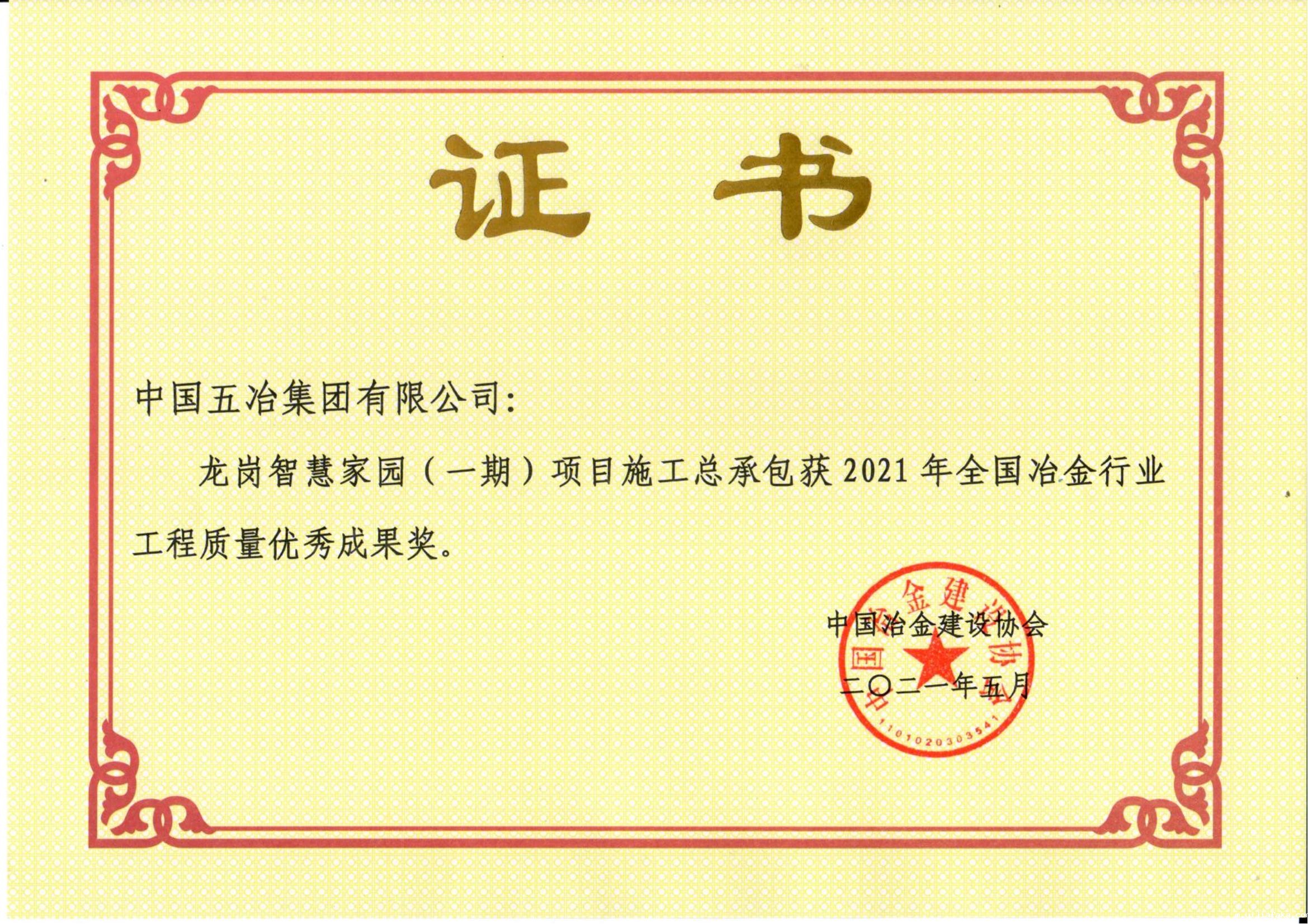龙岗智慧家园(一期)项目施工总承包获2021年全国冶金行业工程质量优秀成果奖