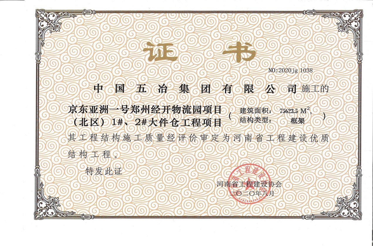 京东亚洲一号郑州经开物流园项目(北区)1#、2#大件仓工程项目荣获2020年河南省工程建设优质结构工程