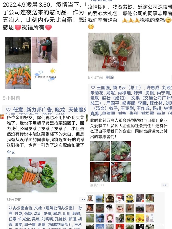 在五冶大礼包连夜送达后,在沪员工的朋友圈、微信群里“炸开了锅”,既有惊喜,更有感动,最多的则是油然而生的归属感、自豪感。“在最需要的时候收到公司的温暖,作为一名老五冶人,我感到十分骄傲!”一位离退休员工表示。