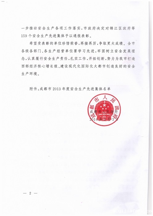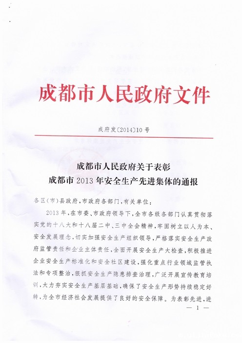 2014年3月3日,伟德victor荣获成都市2013年安全生产先进集体称号。