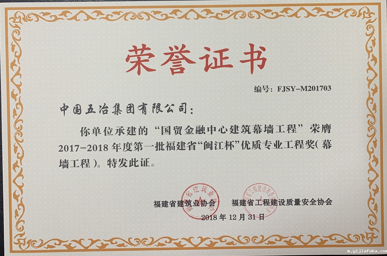 国贸金融中心建筑幕墙工程荣获2017—2018年度第一批福建省“闽江杯”优质专业工程奖(幕墙工程)