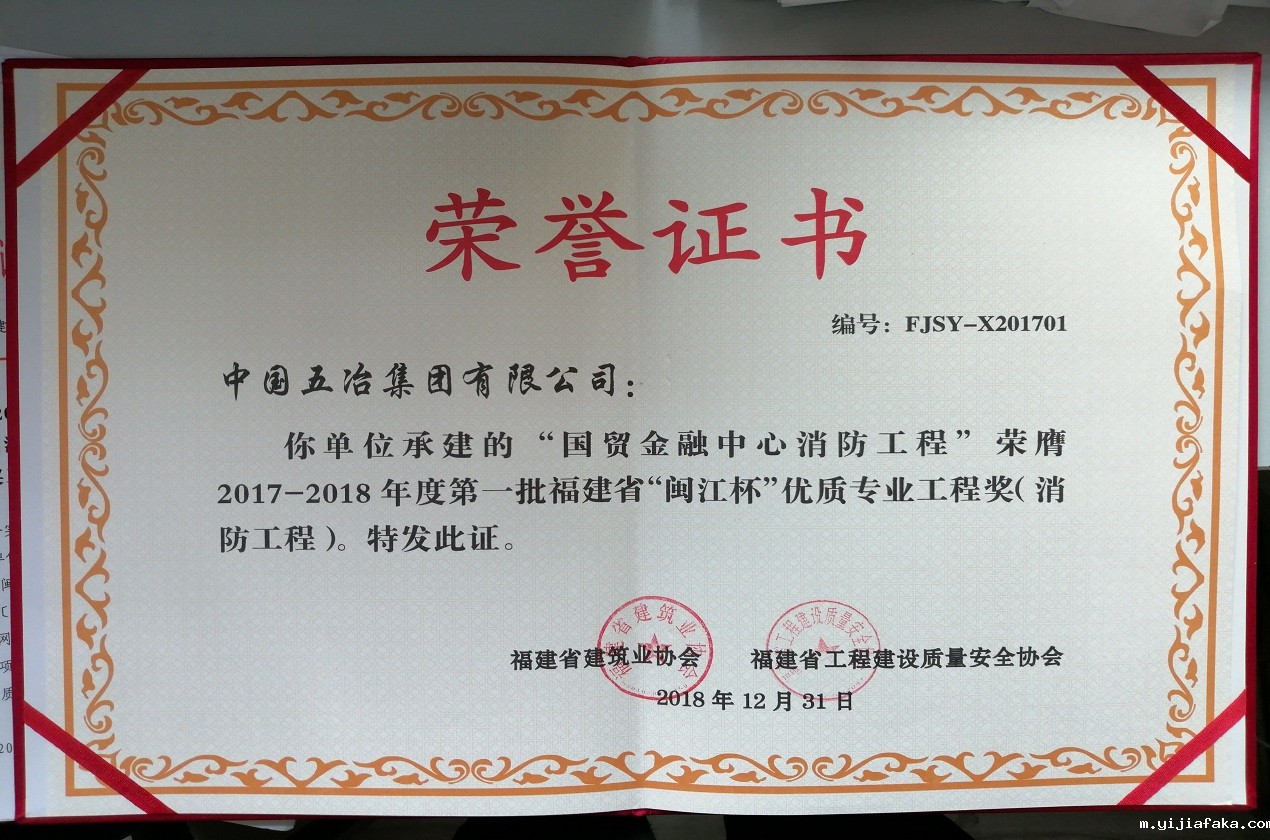 国贸金融中心消防工程荣获2017—2018年度第一批福建省“闽江杯”优质专业工程奖(消防工程)