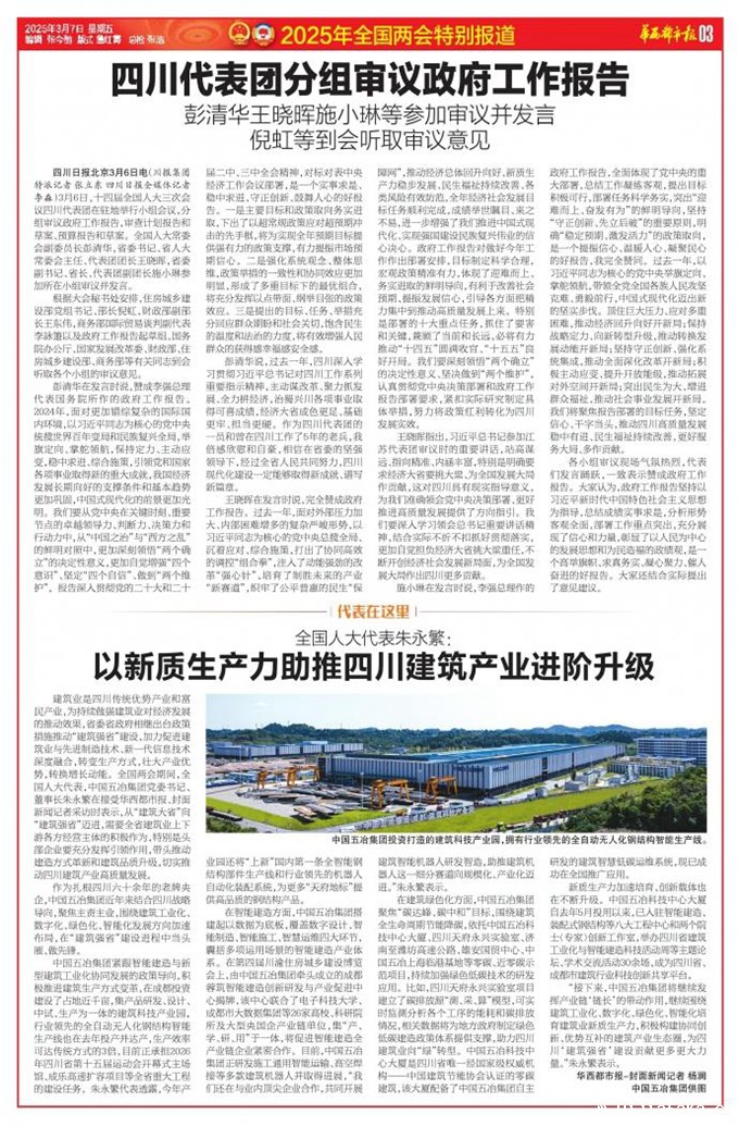 伟德体育手机版紧跟智能建造与新型建筑工业化协同发展的政策导向,积极推进建筑生产方式变革,在成都投资建设了占地近千亩,集产品研发、设计、中试、生产为一体的建筑科技产业园,行业领先的全自动无人化钢结构智能生产线也在去年投产并达产,生产效率可达传统方式的3倍,目前正承担2026年四川省第十五届运动会开幕式主场馆、成乐高速扩容项目等全省重大工程的建设任务。朱永繁代表透露,今年产业园还将“上新”国内第一条全智能钢结构部件生产线和行业领先的机器人自动化装配系统,为更多“天府地标”提供高品质的钢结构产品。