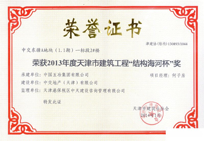 中交东疆A地块(1. 1期)一标段2#楼--2013年度天津市建筑工程“结构海河杯奖