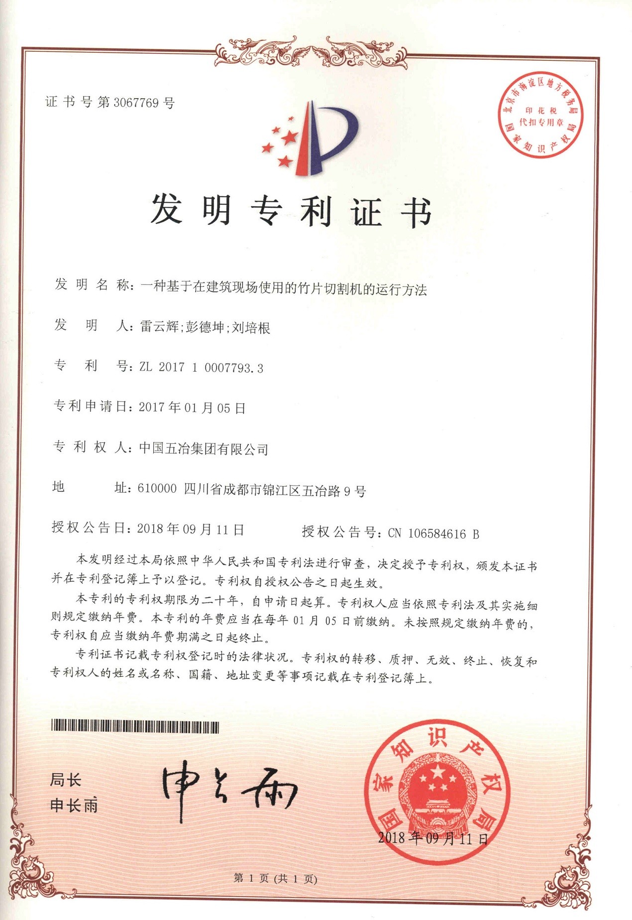 一种基于在建筑现场使用的竹片切割机的运行方法 ZL 201710007793.3