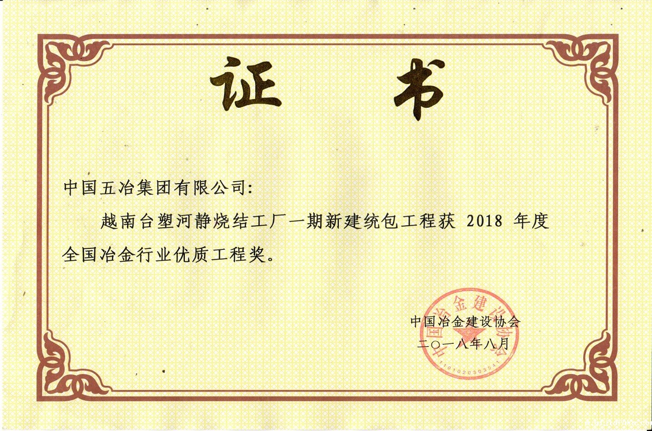 越南台塑河静烧结工厂一期新建统包工程——2018年全国冶金行业优质工程奖