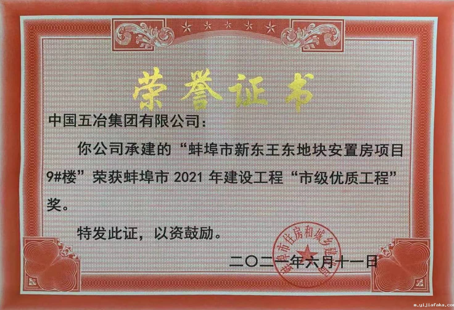 蚌埠市新东王东地块安置房项目9#楼荣获蚌埠市2021年建设工程“市级优质工程”奖