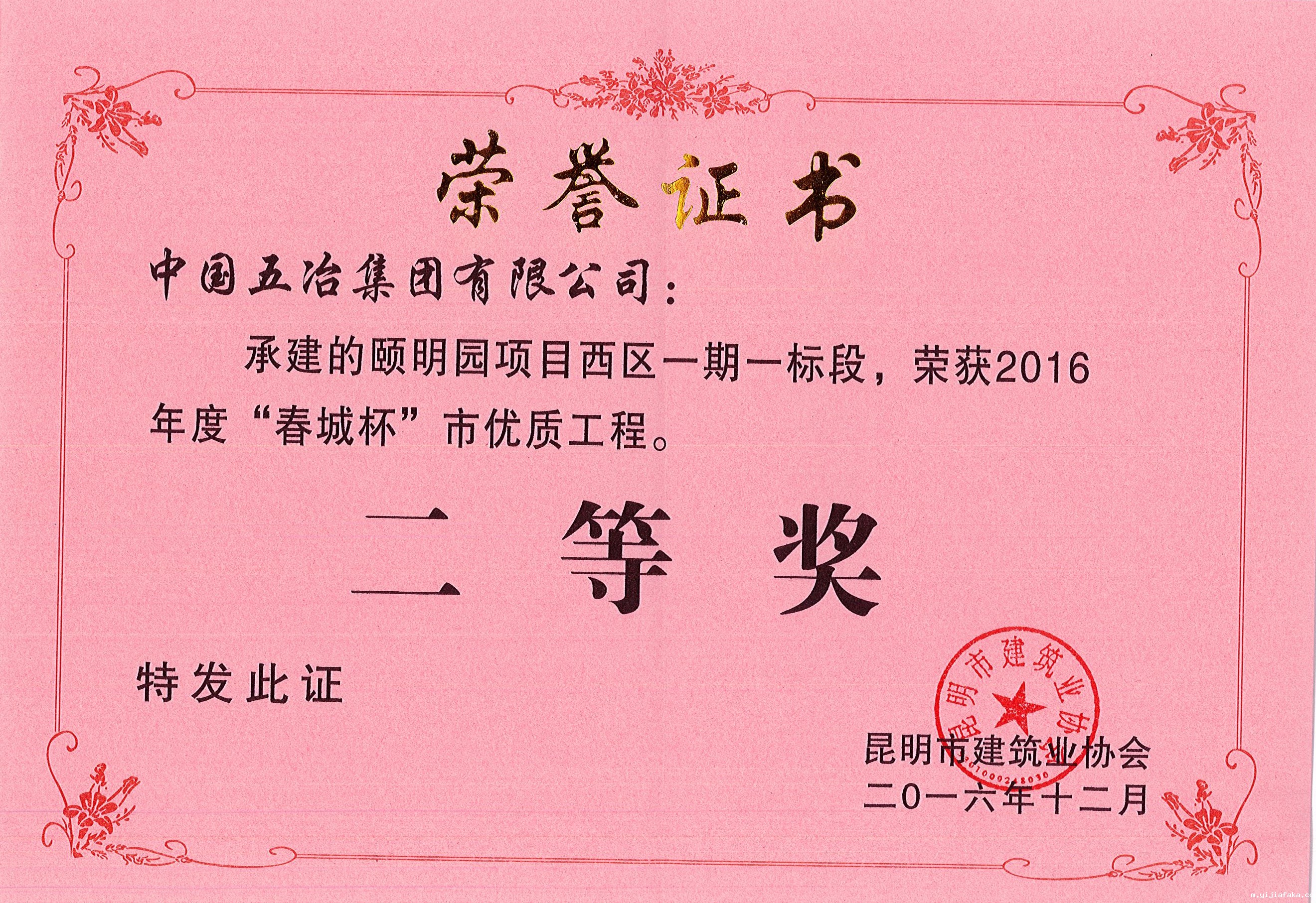 颐明园项目西区一期一标段—2016年度昆明市春城杯二等奖