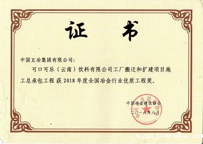 可口可乐(云南)饮料有限公司工厂搬迁和扩建项目施工总承包安装工程-2018年度全国冶金行业优质工程奖