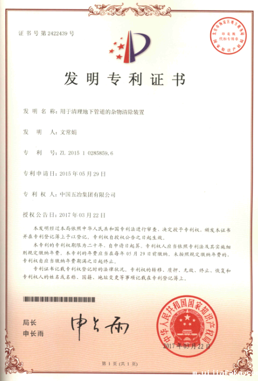 用于清理地下管道的杂物清除装置 ZL2015102858596